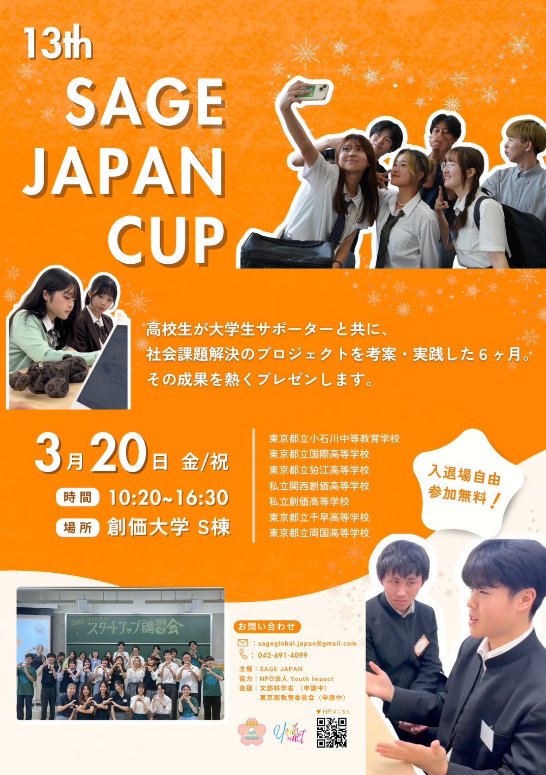 第13回SAGE JAPAN CUPの開催が近づいてきました。以下が詳細です。 日時:2026年3月20日(金•祝) 10:20-16:30 場所:創価大学 大教室棟(S棟) 東京都八王子市丹木町1-236 第13回SAGE JAPANでは、高校生たちが大学生サポーターと共に、約6か月間にわたり社会課題解決プロジェクトに取り組んできました。 本大会では、その集大成として、生徒たちが企画・実践してきた成果を熱く発表します。 挑戦と成長が詰まった高校生たちの晴れ舞台を、ぜひ会場でご体感ください。